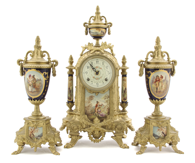 A Continental Sevres Style Porcelain and Gilt Metal Mounted Clock Garniture,