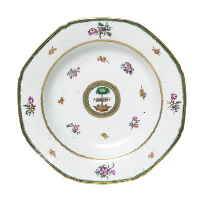 18th century, of octagonal form, centered with the crest of Lady Hamilton, with further gilt and polychrome floral decoration.