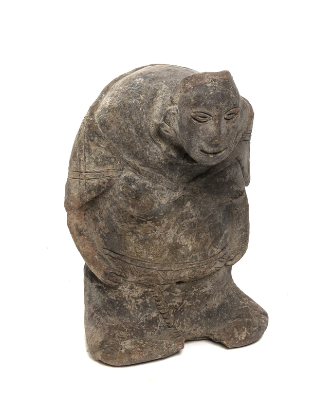 depicting a hunched female wearing incised clothing, a beaded necklace and earrings.