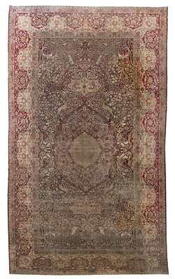 circa 1900, the central medallion decorated with opposing mallards on a reserve of lions, peacocks and other birds among blossoming trees, having multiple floral and foliate borders further interspersed with birds and lion masks.