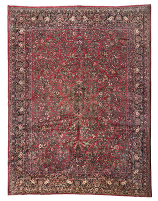 first half of 20th century, having allover foliate decoration on a red reserve within multiple borders.