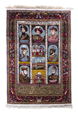 of rectangular form having images of shah, with inscriptions throughout and contained in a foliate border depicting deer and other figures.