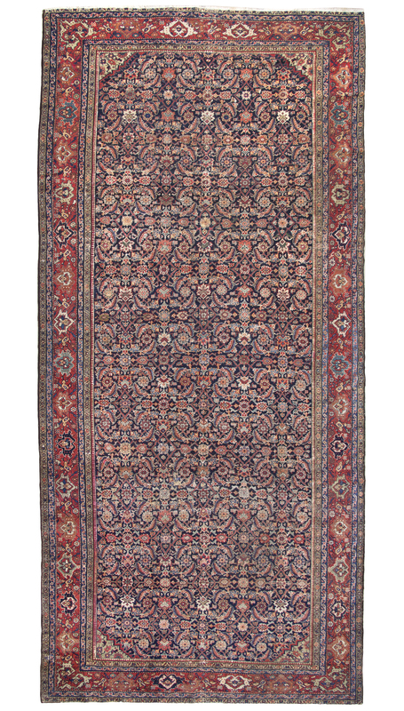 the central field with repeating stylized floral decoration on a navy reserve within multiple borders.