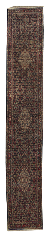 having three stylized foliate center medallions on an allover decorated field within triple borders.
