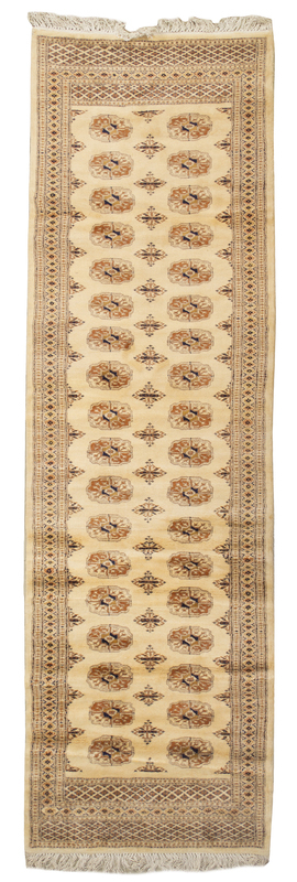 having two rows of geometric medallions on an ivory field within multiple borders.