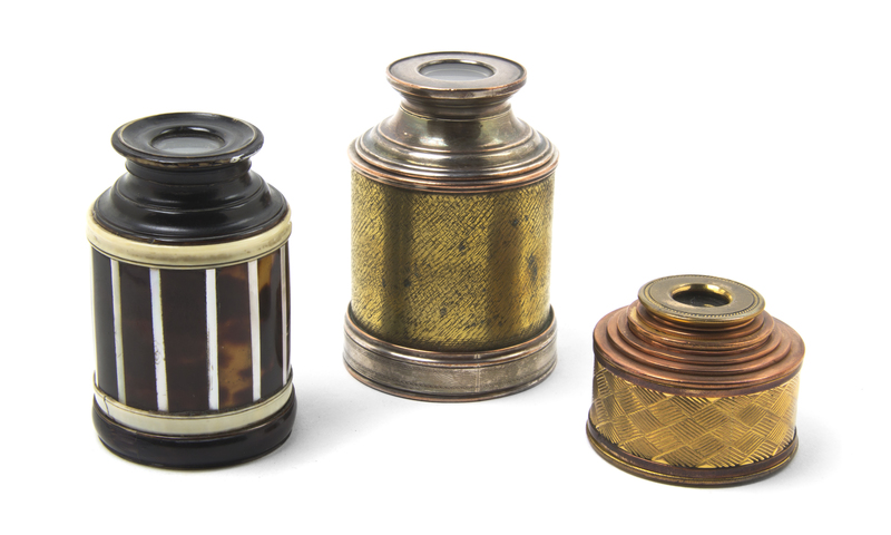 the first with tortoise shell, ivory and mother-of-pearl inlays, the other two brass, all unmarked.