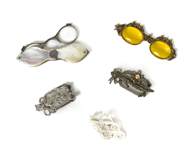 the first in a mother-of-pearl case, the second two in the form of brooches, together with a mother-of-pearl monogram brooch and tinted glasses.