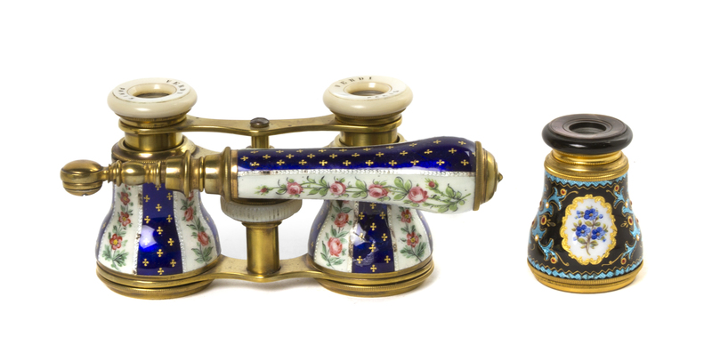 Paris, the cylinders and handle decorated with alternating panels of flowers and crosses, together with an unmarked enameled monocular having allover foliate decoration on a black field.