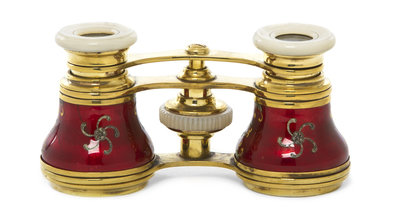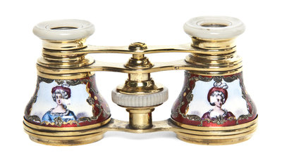 decorated with two ladies in profile on a red field, having mother-of-pearl eyepieces and adjuster wheel.