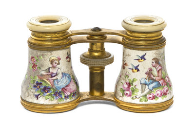 decorated with a lady and a gentleman in a landscape, the verso with musical trophies, having mother-of-pearl eyepieces and adjuster wheel.