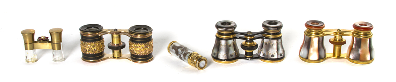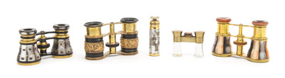 two pairs with mother-of-pearl veneers, together with a pair of scent flasks in the form of opera glasses and a mother-of-pearl atomizer.