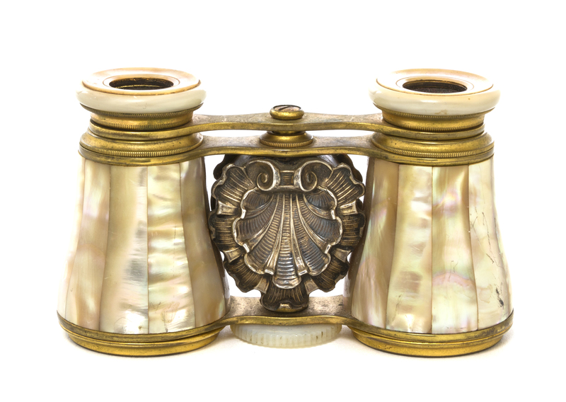 A Pair of Mother-of-Pearl Veneered and Silver Set Opera Glasses,