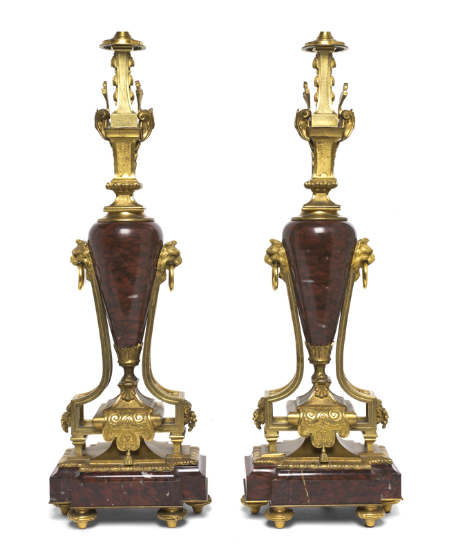 A Pair of French Rouge Marble and Gilt Bronze Lamps,