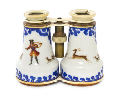 A Pair of Continental Enameled and Ivory Inset Opera Glasses,