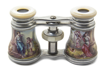 A Pair of French Enameled and Mother-of-Pearl Inset Opera Glasses,