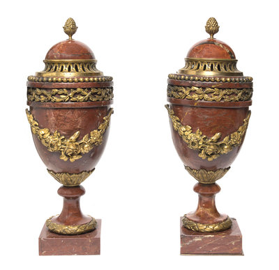 A Pair of Neoclassical Rouge Marble and Gilt Bronze Mounted Urns,