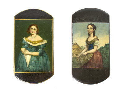 each decorated with a portrait of a lady.