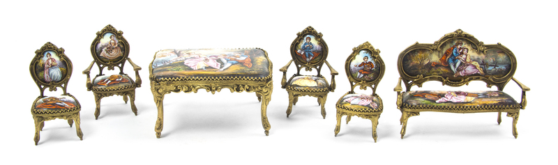 A Continental Enameled Gilt Metal Diminutive Parlor Suite,