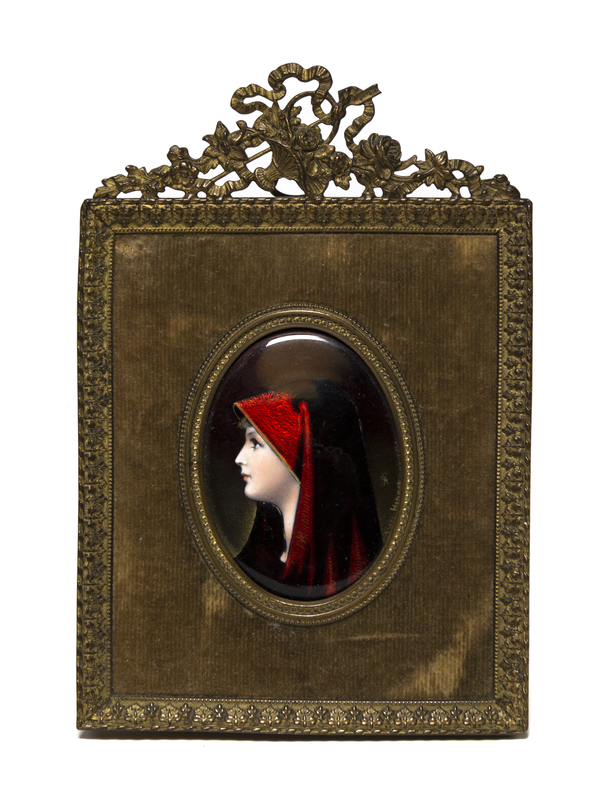depicting St. Fabiola in profile, set in a velvet and gilt metal frame with a basket and ribbon crest.