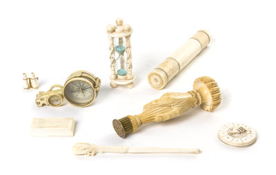 comprising a seal in the form of a hand holding a torch, a three-compartment cylindrical box, a cigarette holder, a timer, a compass/binocular set, a diminutive model of binoculars, a box containing gaming pegs and a gaming marker.