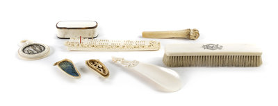 comprising a clothes brush, a shoe horn, a game board, a silvered metal medallion in an ivory frame, two boxes and a scoop.