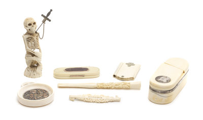 comprising two boxes, a notepad, a cigarette holder, a silver metal mounted medallion, a model of a skeleton and a pin.