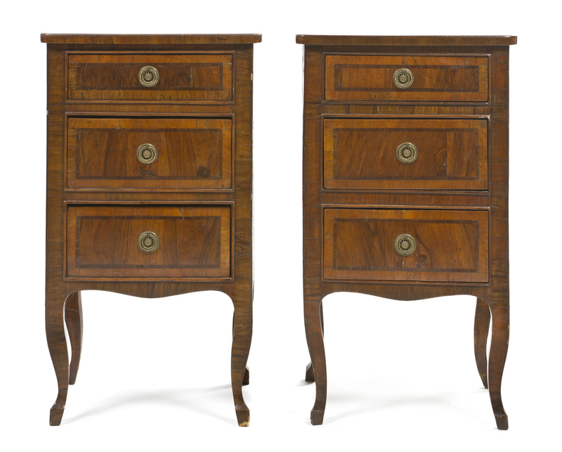 each having a rectangular top over a conforming case, fitted with three graduated drawers, raised on cabriole legs.