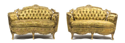 each having pierce carved bird and foliate decorated crests over the upholstered tufted back, arms and seat, raised on cabriole legs ending in scrolled toes.