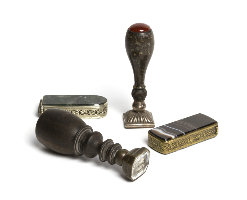 each with a glass stamp, together with two hardstone inset matchboxes.