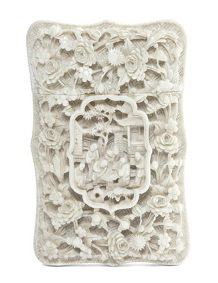 of rectangular form the central cartouche decorated with a figural scene amidst scrolling flowering branches, the verso decorated with figures in a village.