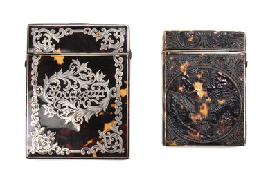 having an inscription within a scrolling foliate border, together with an embossed tortoise shell case with ivory banding.