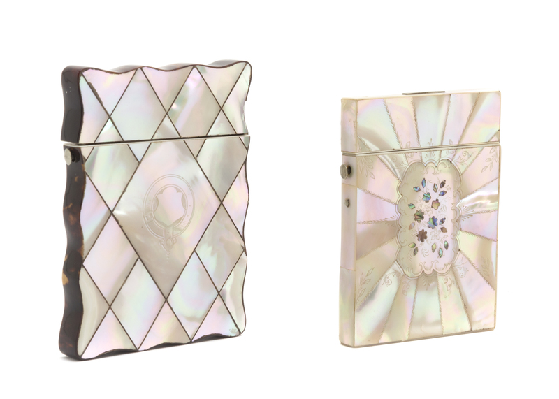 the first with an all over diamond pattern and a tortoise shell edge, the second having a radiating pattern centered with iridescent floral decoration.