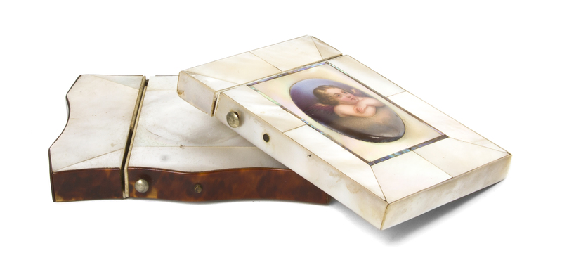 each of rectangular form, one with tortoise shell banding, the other centered with a plaque depicting a putto.