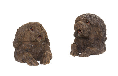 late 19th/early 20th century, each in the form of a shaggy terrier with glass inset eyes, the collars carved Rothenburg, the hinged lids opening to ink pots.