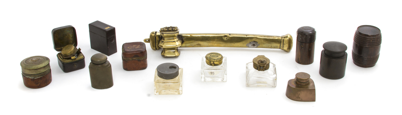 of various forms, mediums, and sizes including two wood examples, one of barrel form, four leather wrapped examples and others, together with a brass pen and inkwell case.