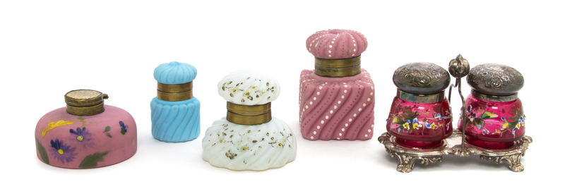 comprising four satin examples including three swirled bodies of various forms and decoration and a circular example with floral decoration and a pair of red stained examples with enameled floral decoration set on a silverplate stand.