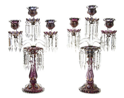 each of baluster form, issuing the scrolling candle arms, hung with prisms throughout.