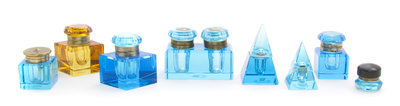 comprising two pyramid forms, two square, a faceted circle, a rectangular double example and a diamond form, together with a matching yellow glass diamond example.