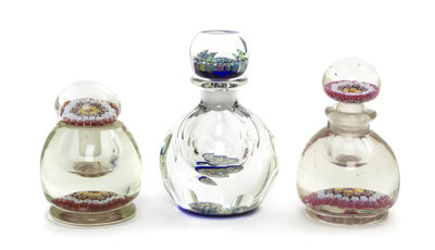 the spherical bottle and stopper having circular facets and internal polychrome decoration, together with two associated examples.