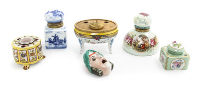 comprising a faience example, the ink cup reading Grace Line New York, a French example with a gilt cover, another French example depicting a classical face, a Delft example and two others.