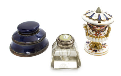 in the Imari pattern, having a floriform lid over the campagna body set on paw feet raised on a circular base, together with a Royal Doulton blue glazed stoneware example and a jasperware inset sterling silver mounted glass example.