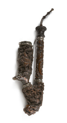 decorated with the scene of a boar hunt, further decorated with a stag's mask and claws grasping a ball.