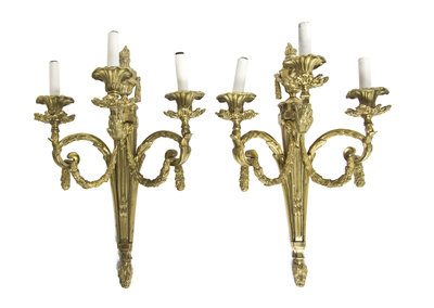 A Pair of Louis XVI Style Gilt Bronze Three-Light Sconces,