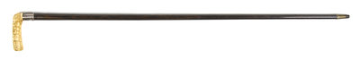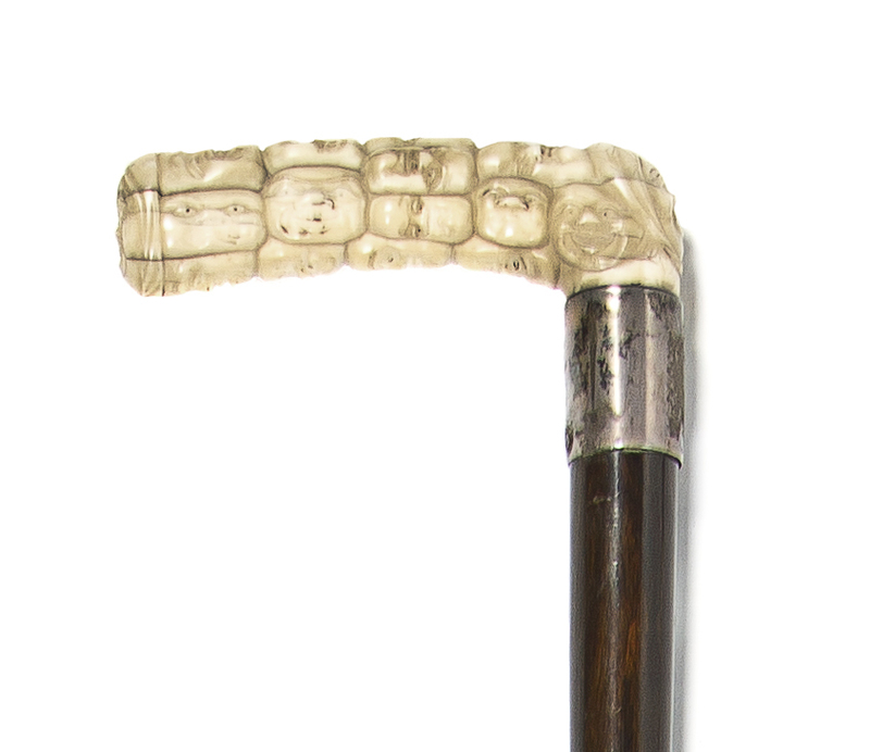 decorated with repeating faces with various expressions, having an English silver collar, George Betjemann & Sons, London, 1904, set on a tapering calamander shaft, ending in a brass ferrule.