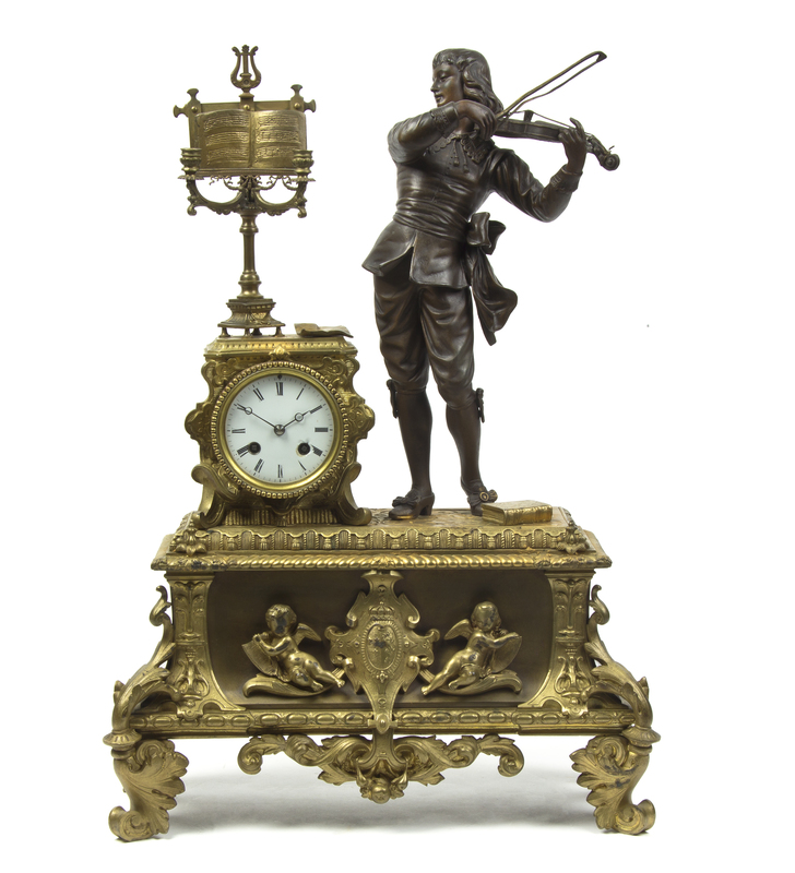 cast as a man in 18th century attire playing the violin and reading sheet music from a stand, above the case fitted with a circular dial having Roman numerals, the whole raised on a trapezoidal plinth base with putti and shield decoration, having time and strike movement.