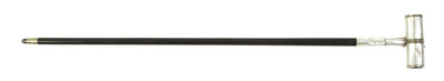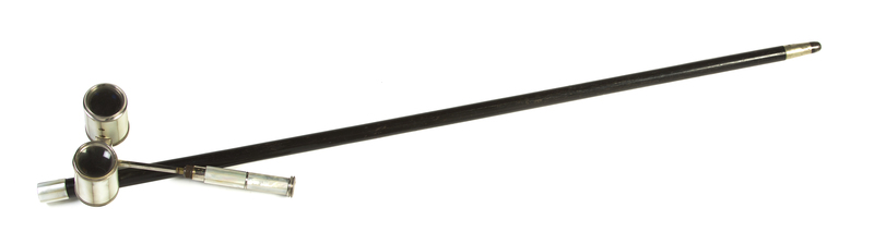 the cylindrical, monocular form handle opening to the adjustable lenses, raised on an ebonized tapering wood shaft, ending in a nickel and steel ferrule.