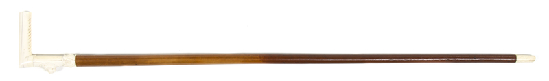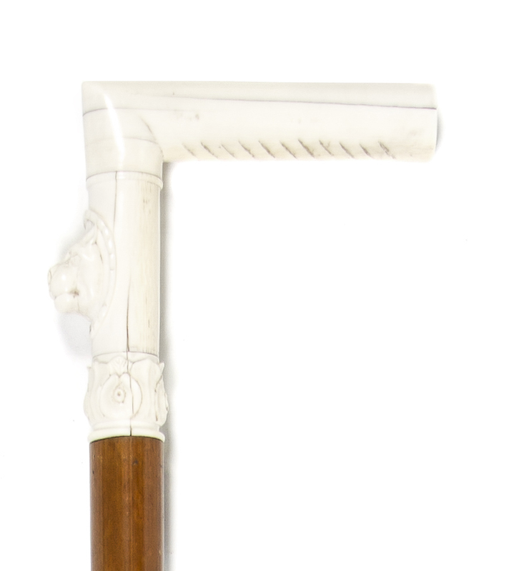 of L-form, with a dog mask and foliate decoration, raised on a tapering wood shaft, ending in a bone ferrule.