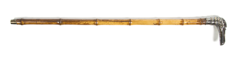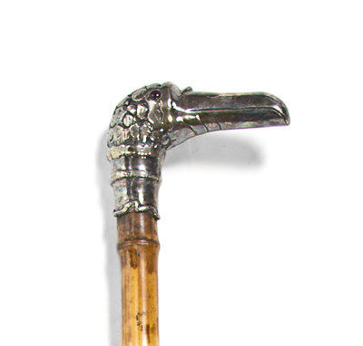 the handle in the form of a bird's head with glass eyes, raised on a bamboo shaft, ending in a brass and steel ferrule.