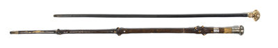 one with a silverplate handle, the other with a gilt metal handle, raised on various wood shafts, one ending in a brass and steel ferrule.