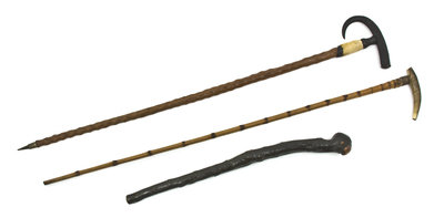 together with two canes, one having faux carved hoof and deer fur decoration below the horn handle, the other with a horn handle and a bamboo shaft.